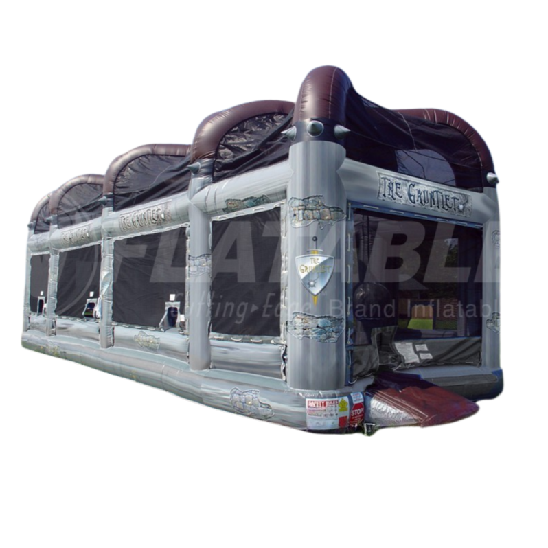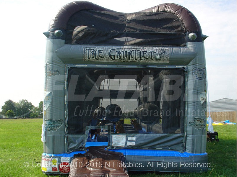 The Gauntlet is the perfect interactive challenge. Two opponents face off head-to-head, zig-zagging across raised foam platforms while they dodge 6 swinging foam boulders being hurled at them. The first person to make it to the other side without falling wins. It's a dash to the finish in this game that combines both speed and strategy. The Gauntlet is a game that almost anyone can enjoy. Less active participants can enjoy being a "boulder-thrower" while more active participants attempt to complete the challenge. This unit is also available in our colorful Wacky theme.