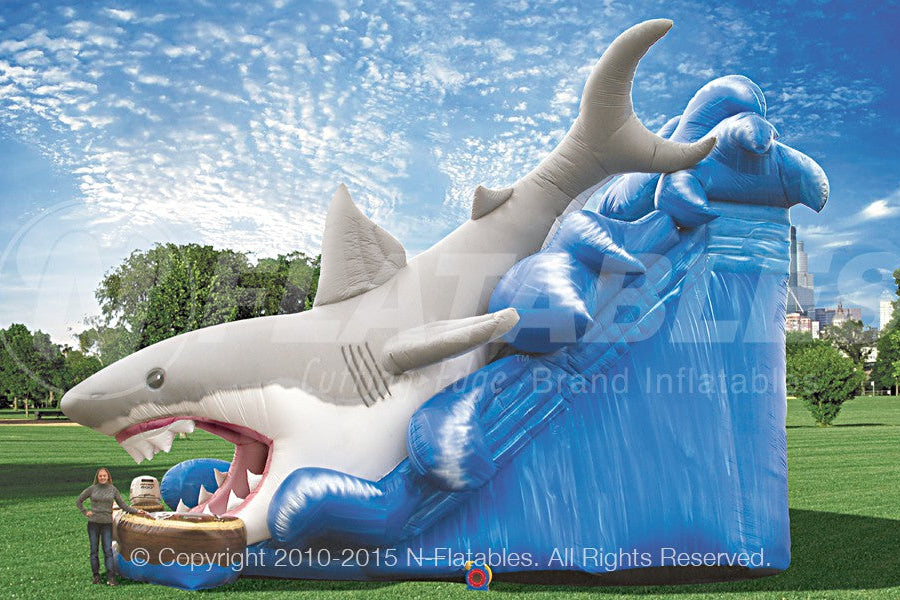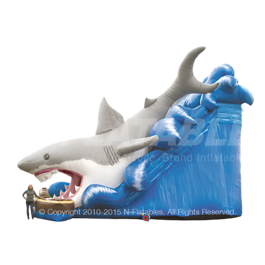 This bestseller features realistic digital artwork and eye-catching water colored vinyl. It has 1 slide lane and 1 climbing lane. It is avaiable in 2 other sizes as well as a water slide version. This unit uses the patented CAS System (U.S. Patent #7,300,354) to prevent quick deflation in the event of a power loss.