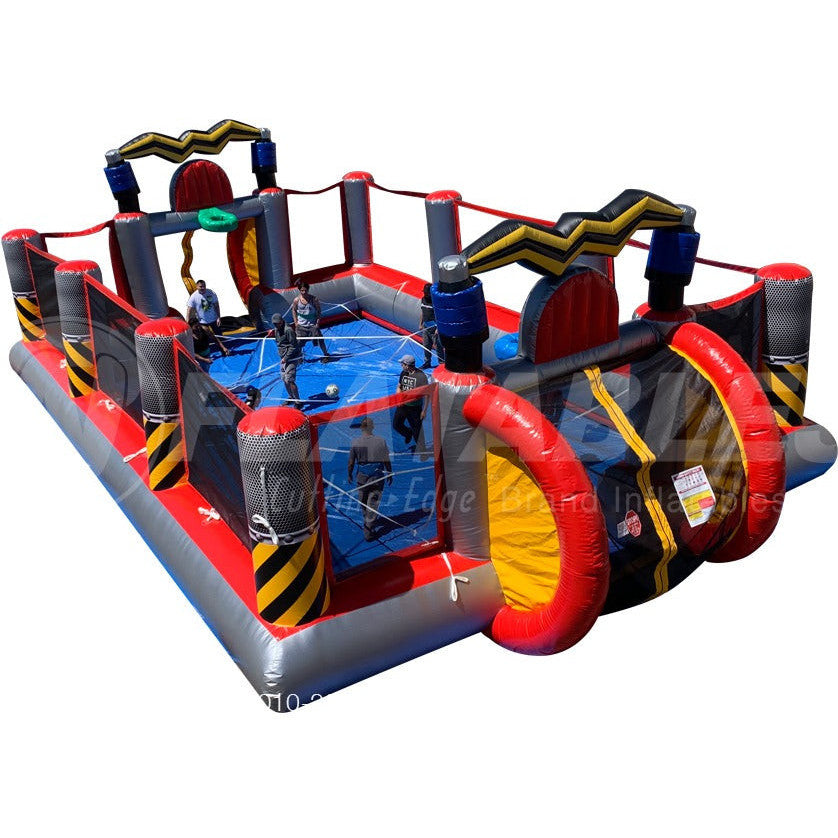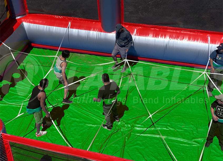 The popular table game of Foosball comes to life in this life-size inflatable version. A 48' x 27' playing area allows up to 12 people to keep the ball in play. Players get harnessed into place so that they can only move side to side to kick the ball. This unit is great for corporate or school events and fundraisers. The colors are easily customizable.