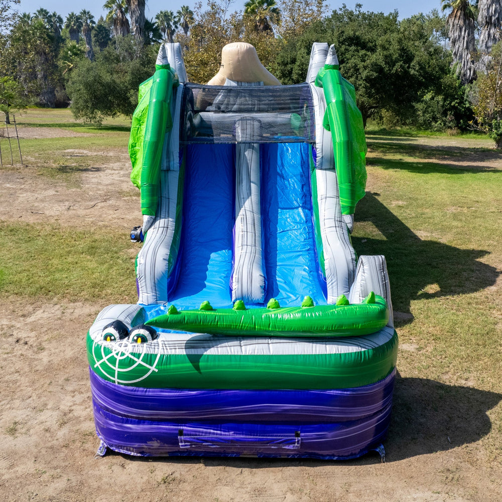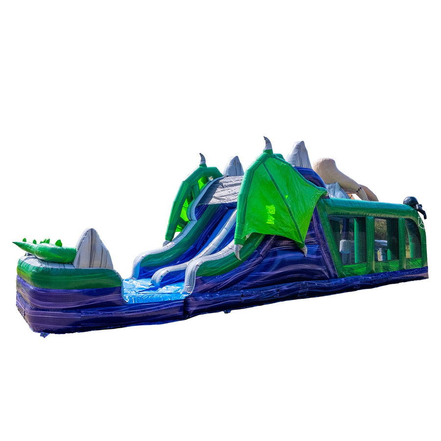 The Monster dragon wet dry obstacle is all up and ready to go! It features a detachable inflatable splash pool (landing zone) for wet or dry use, tunnel, climbing wall, obstacle pops, and inflatable splash pool.