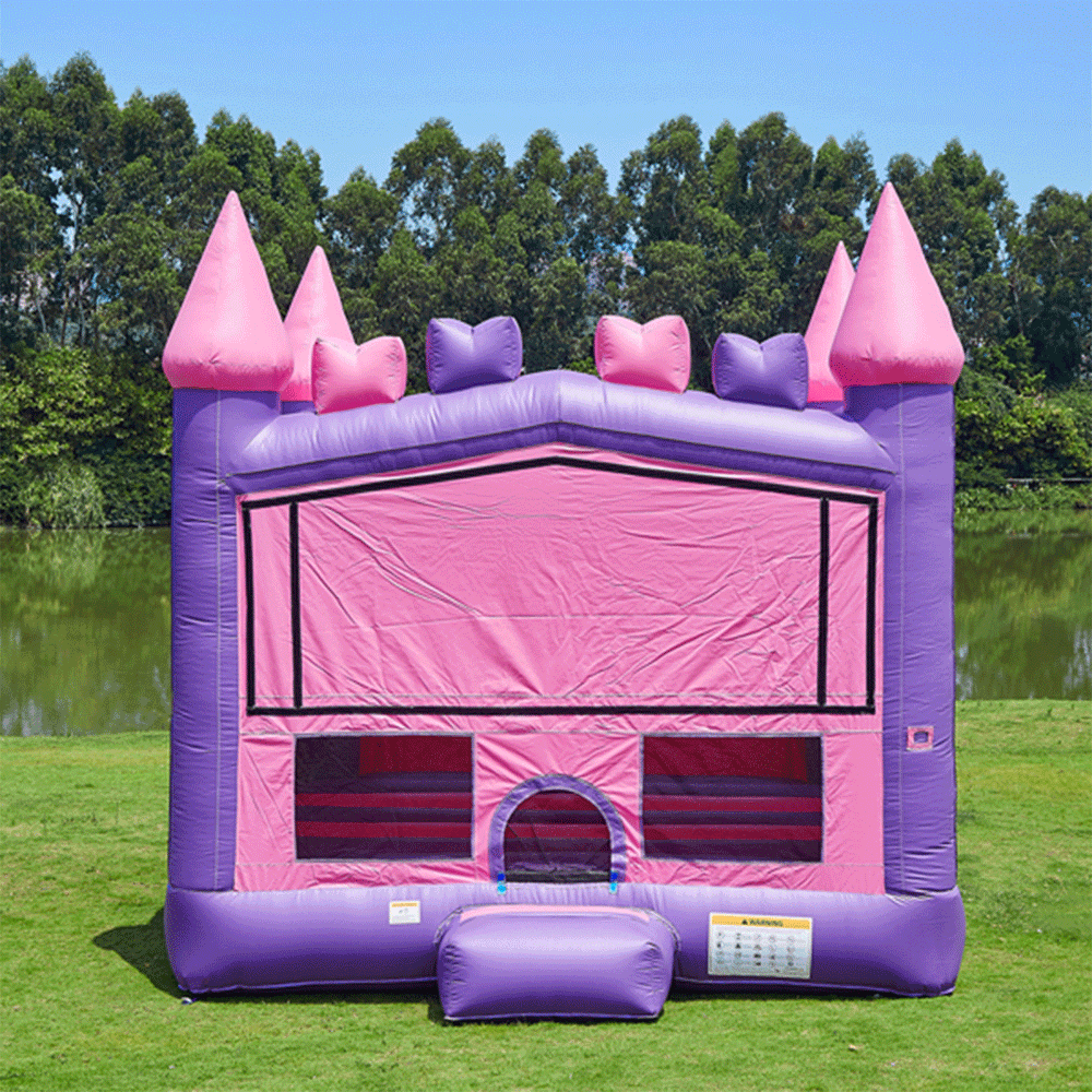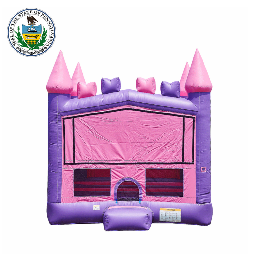 The Princess 13' X 13' Bounce House is a princess' perfect playtime palace! This bounce house is clothed in royal pink and purple and is crowned with hearts. A basketball hoop is also inside to complement the ample bouncing space. Made with lead-free 15 oz. PVC vinyl, this unit is a reliable inflatable for parties and events!