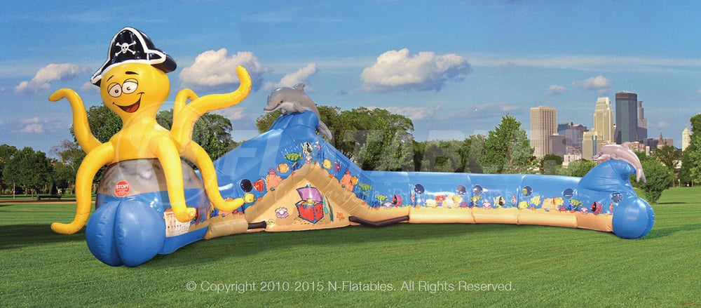 This 50'+ long inflatable features obstacles, climb & slide plus incredible artwork and a whole lot of fun! The inside graphics seem to come alive to create an ”aquarium-like“ feel. Dimensions: Unit size is 13'x14'x56', when set-up is complete, the footprint area is 30'x37'.