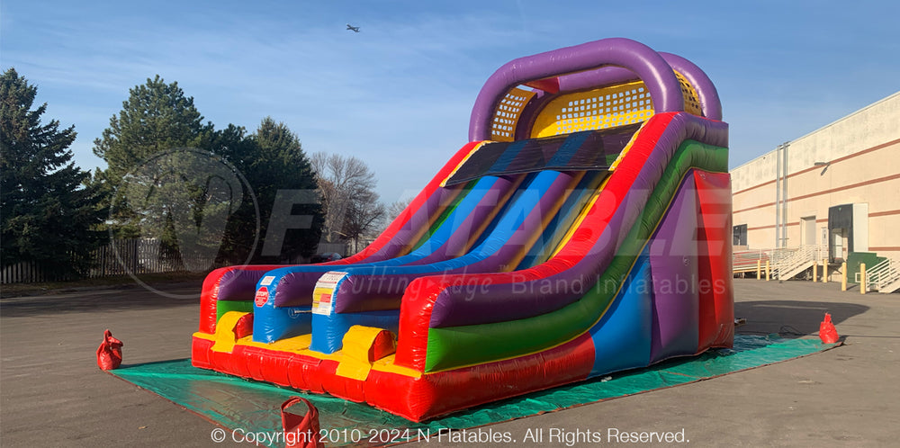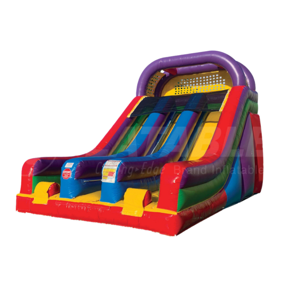 This colorful unit has 2 slide lanes and is ideal for both indoor facilities and outdoor events.