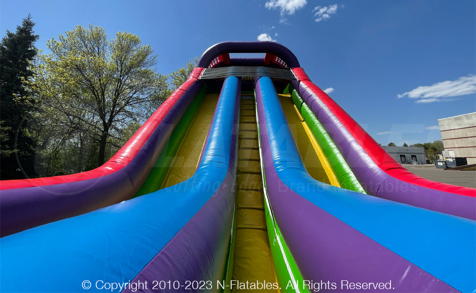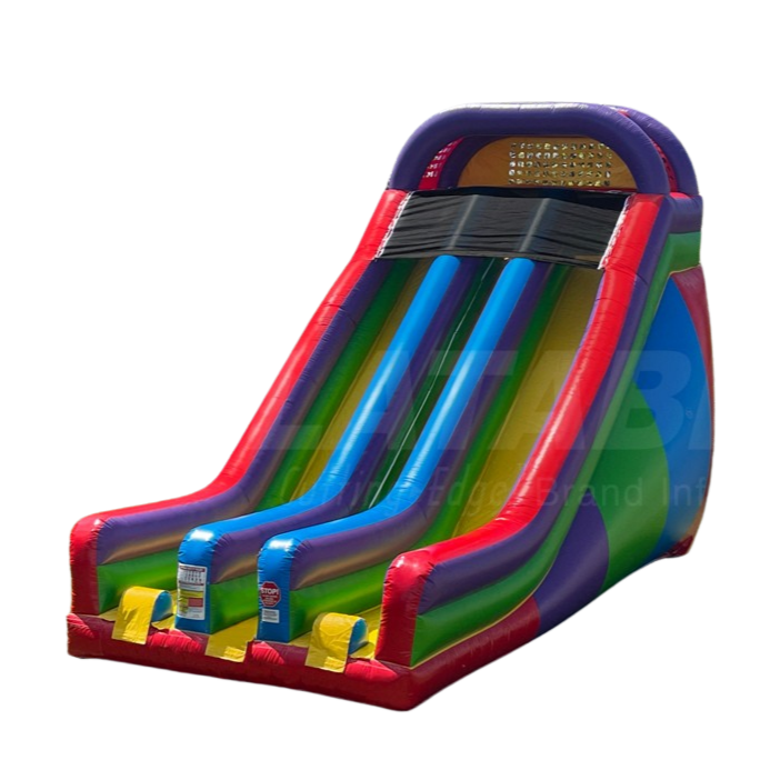 This colorful unit has 2 slide lanes and is ideal for outdoor rentals and events.