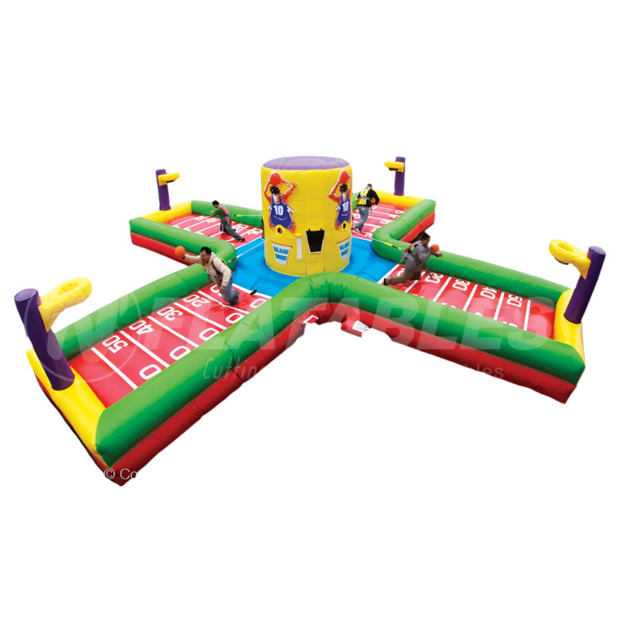 It's our popular equalizer inflatable times two! Up to four patrons can compete with slam-dunk basketball and grid-iron football action! In football mode, players compete to velcro their paton onto the farthest yard line. In basketball mode, players compete to dunk their basketball in the hoop before their oponent.
