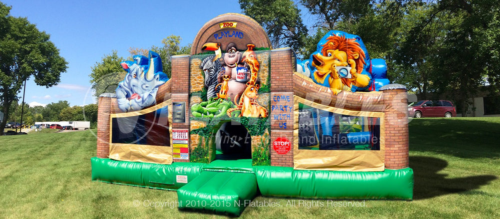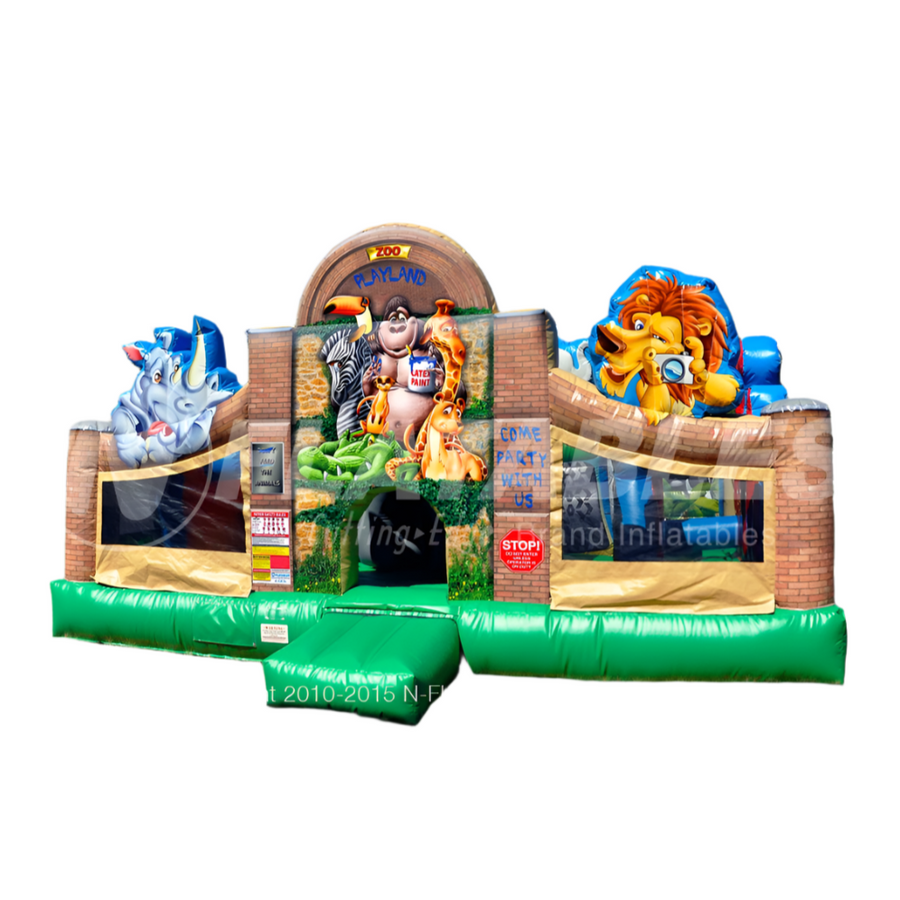 This animal-themed playland is perfect for the littlest of patrons and easily fits into a corner. This inflatable features dazzling digital print both inside and out, kid-friendly obstacles, plenty of bouncing area, and 3-D animal pop-ups. This unit has room for 8 kids and only takes up a small footprint of 16'x19'.