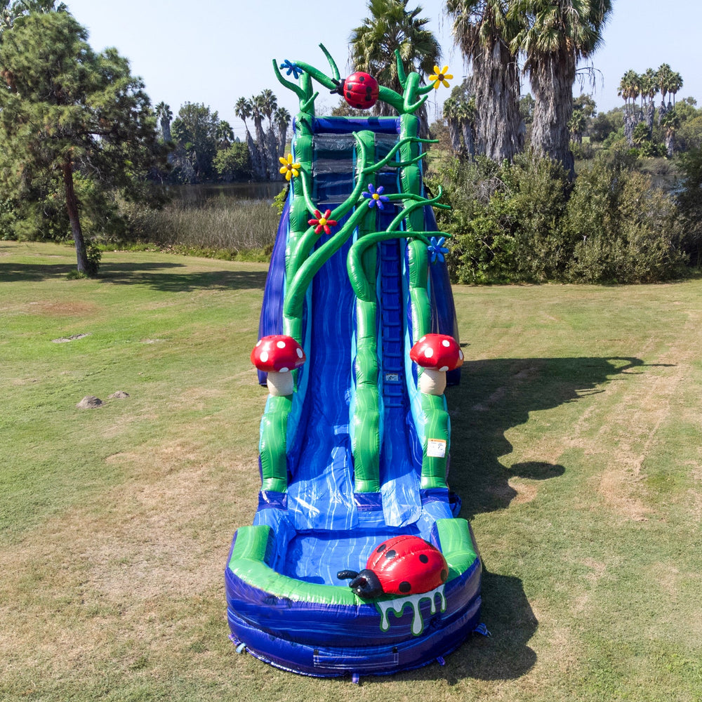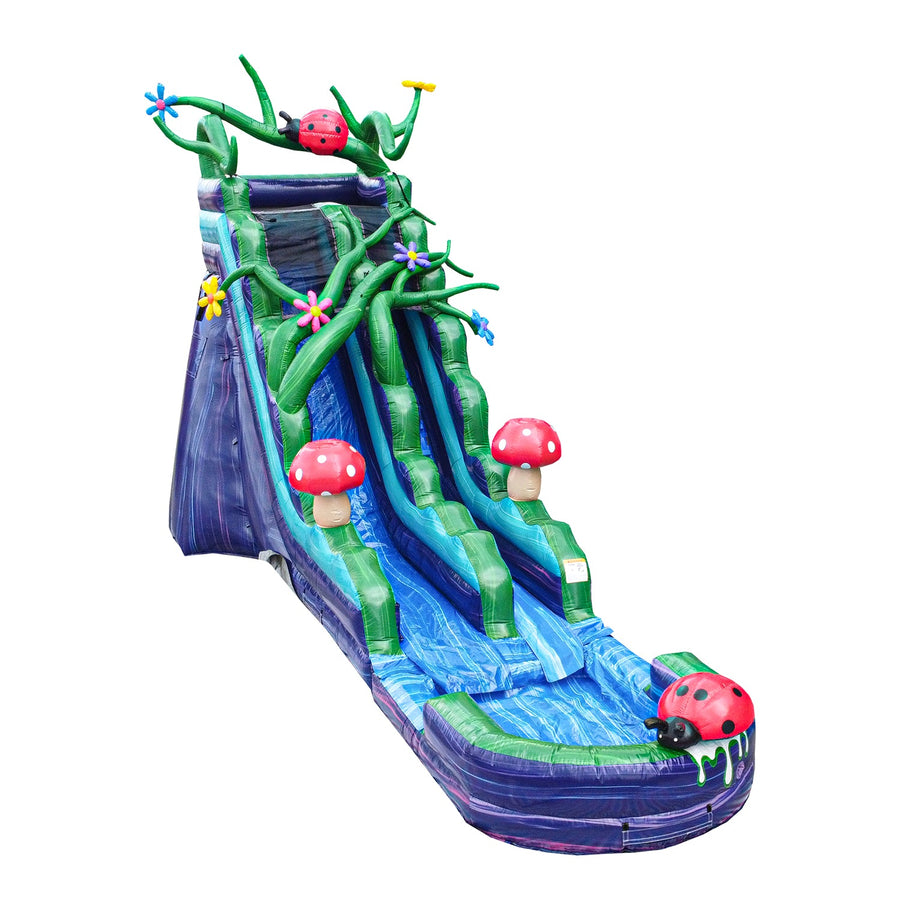 The all-new wet and dry slide with blower and accessories is just what you need. These mega waterparks are made of 100% industrial grade PVC 15 oz Vinyl for heavy usage through many jumping, bouncing, slipping, and sliding sessions. These slides equip with non-slippery climbing material and a handle on the ladder that prevents kids from falling and standing while climbing up. Child safe netting prevents kids from standing up at the platform top; fully covered shade netting ensures that kids can slide down securely. The seams are heat-sealed throughout the slide and pool areas to minimize water leaking. Hassle-free packaging is delivered and unloaded to your home through a freight company.