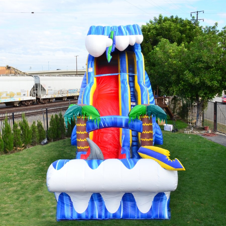 Slide through a shark-infested sea with the Shark Sighted Wave 24 Ft Slide! Riders will surf the wave sliding down but must avoid the waiting shark! The slide comes with safety netting throughout the top half of the slide keeps riders safe going up and sliding down. This inflatable is a great choice for ocean-themed parties and events!