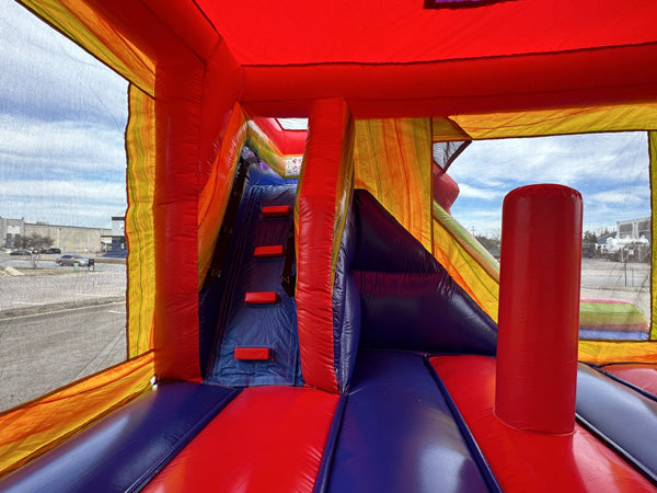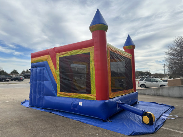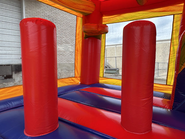 Dura Lite inflatables are constructed from 15oz mixed with 9 oz Light n StrongTM  PVC Vinyl with additional vinyl reinforcement sewn in at all stress points to allow for maximum strength, durability and most importantly, safety. All seams have been double or quadruple-threaded and heat-welded for superior durability and these measures also prevent dirt and sand from damaging the seams, thus prolonging the life of your inflatable and minimizing repairs. Our bounce houses are designed with children's safety at heart, featuring finger-safe netting and safety ramp entrance that promotes more safe entry and exiting from the unit. The unit has commercial-grade webbing and Velcro throughout and zippers for easy deflation when it's time to pack up at the end of the day.