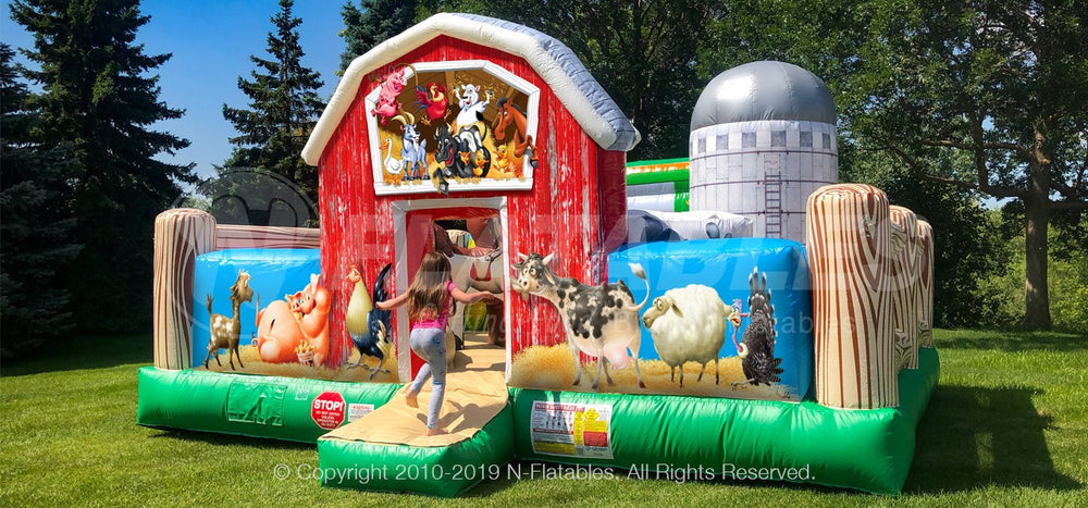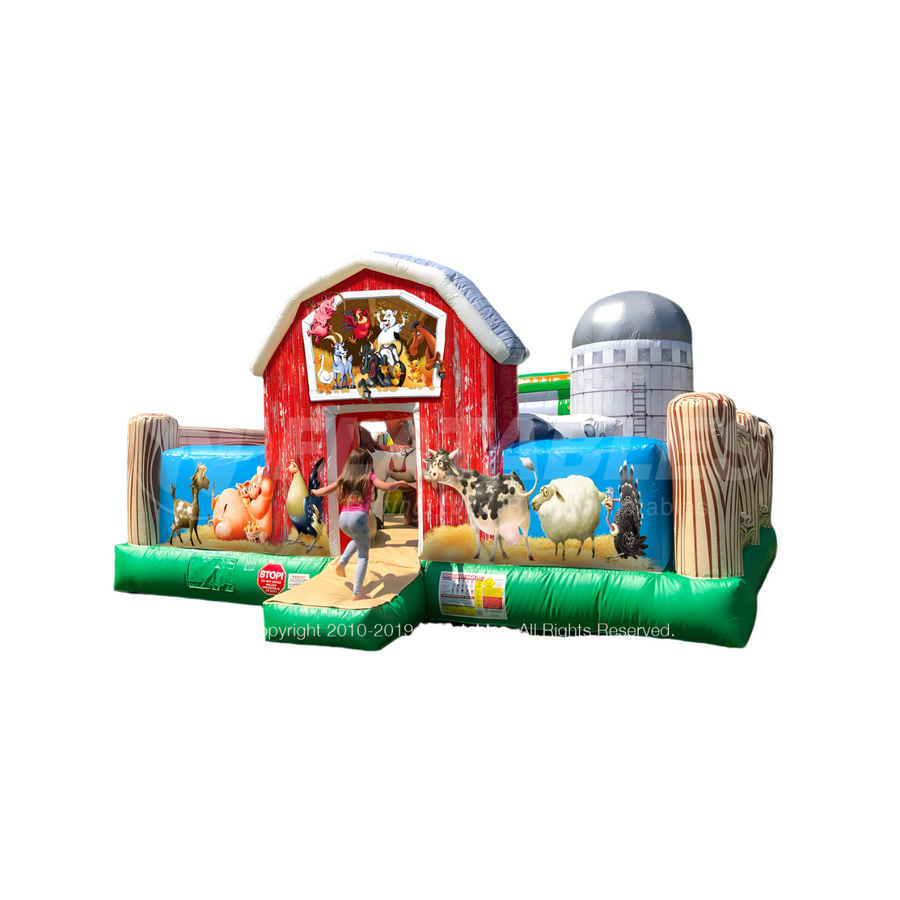 This farm-themed playland is perfect for the littelest of patrons and easily fits into a corner. It features dazzling digital print both inside and out, kid-friendly obstacles, a silo tunnel, tractor climb & slide, plenty of room to bounce and even has an area that can be used as a ball pit. This unit has room for 8 kids and only takes up a small footprint of 16'x19'.