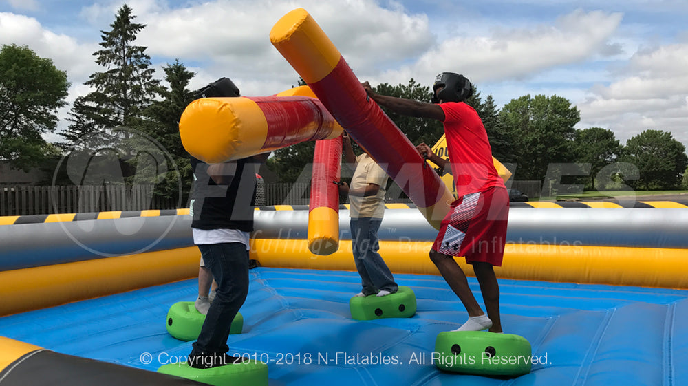 This unit comes with (4) leather headgear, (4) captured-air joust platforms, (4) joust poles, top and bottom tie-down tether straps, anchors, a heavy duty bag, and repair kit.