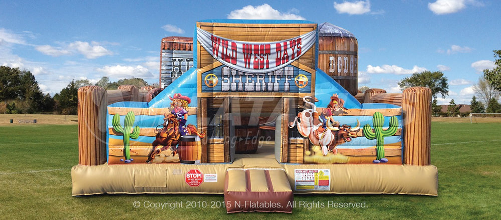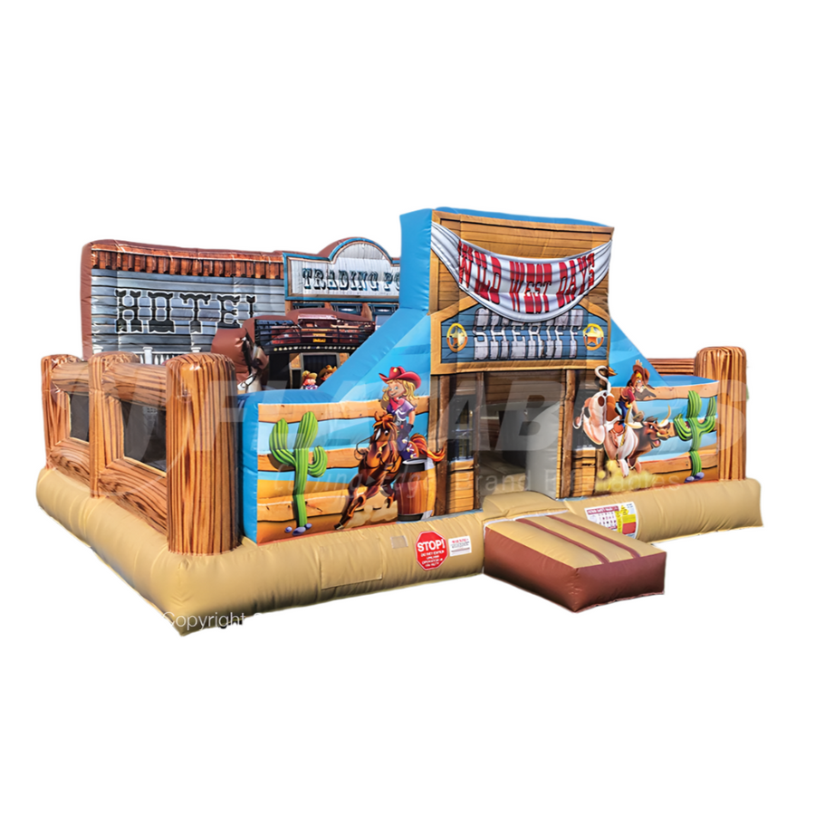 This western themed playland is perfect for the littlest of patrons and easily fits into a corner. It features dazzling digital print both inside and out, kid-friendly obstacles, a tractor climb & slide, and plenty of room for bouncing! This unit has room for 8 kids and only takes up a small footprint of 16'x19'.
