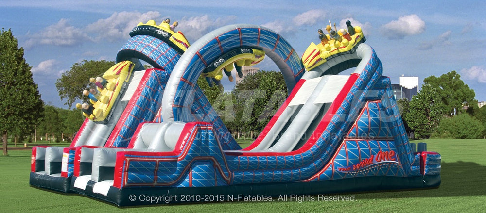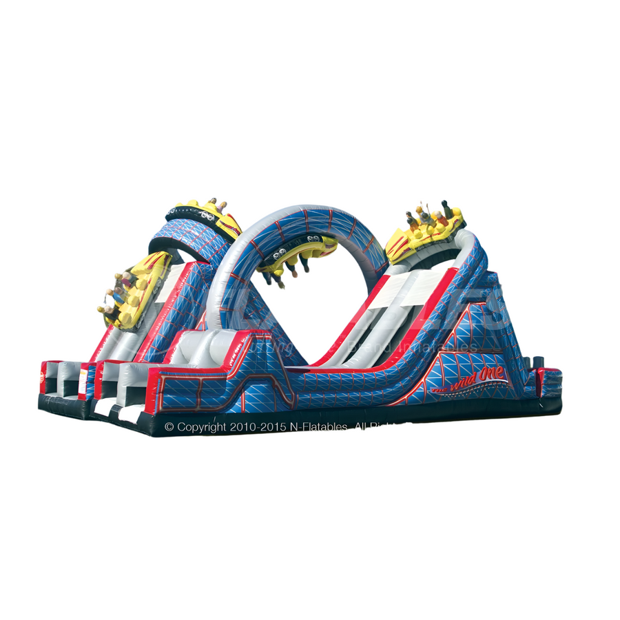 Experience the twisting turns of this exciting inflatable rollercoaster! This unit features eye-catching digital graphics, tackle dummies, squeeze plays, climbing walls, and slides.