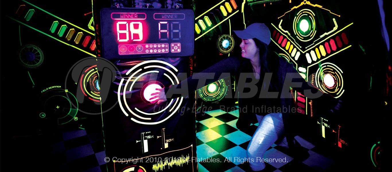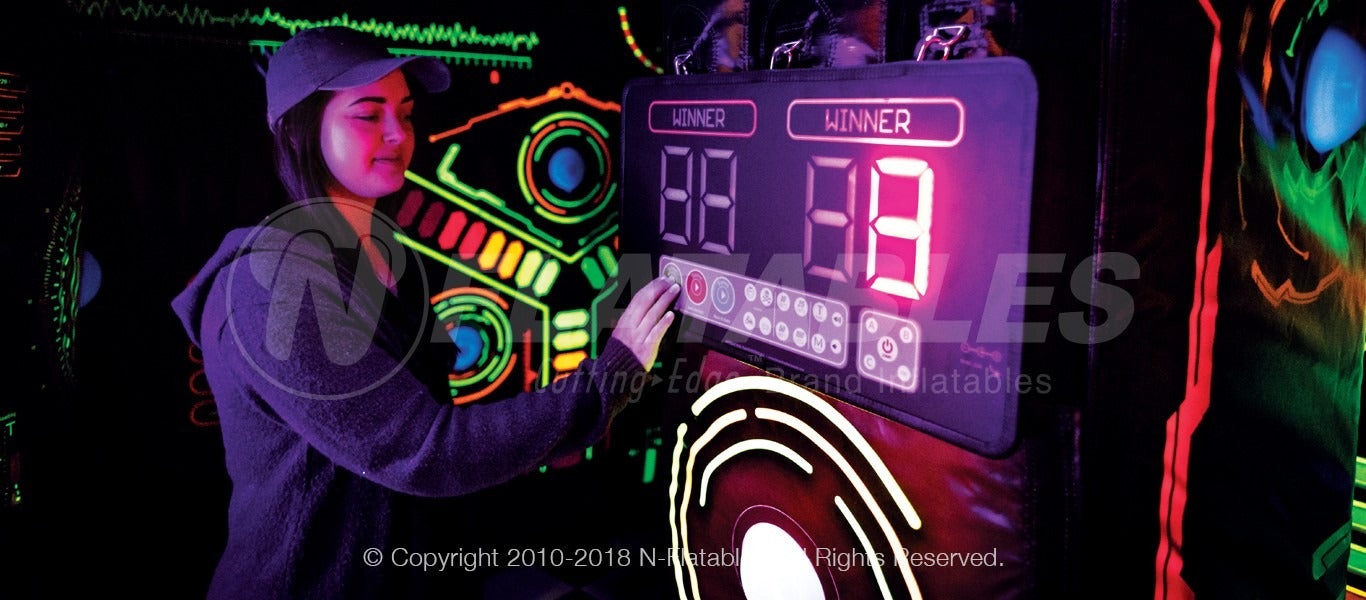 The High Voltage Xtreme Arena™ features internal blacklight florescent printing along with spots for 20 IPS pucks to clip onto the walls. 2 players face off in this crazy fun color-chasing game to see who can score the most points!