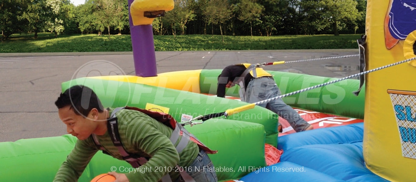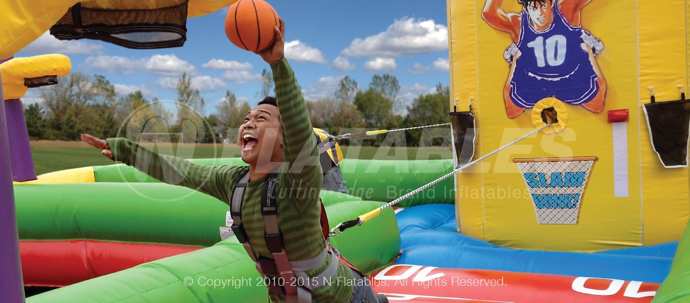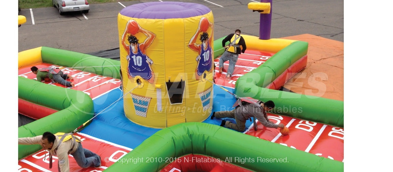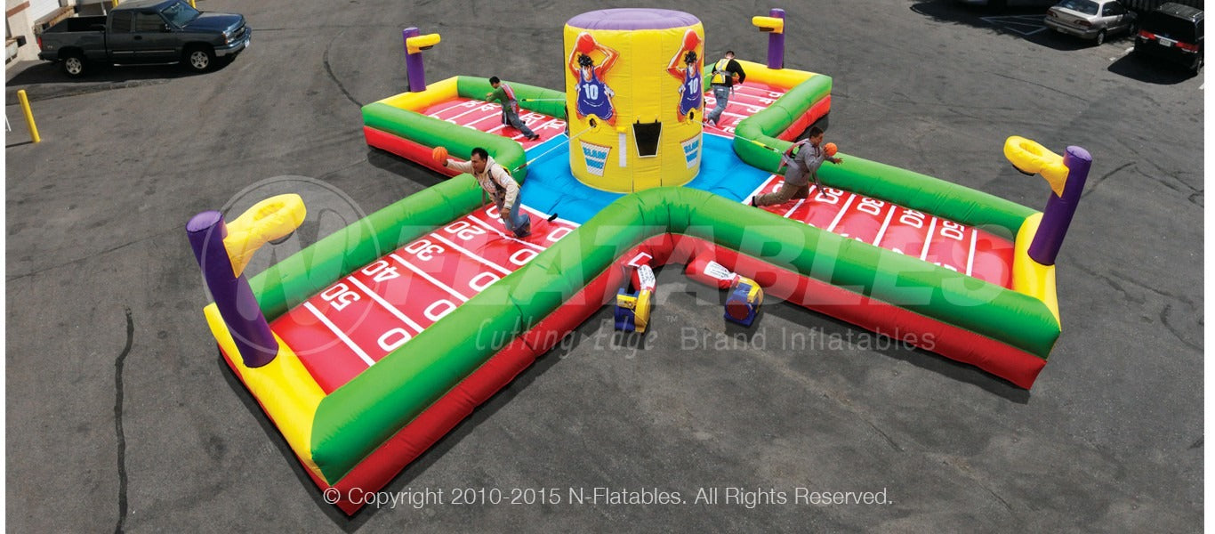 It's our popular equalizer inflatable times two! Up to four patrons can compete with slam-dunk basketball and grid-iron football action! In football mode, players compete to velcro their paton onto the farthest yard line. In basketball mode, players compete to dunk their basketball in the hoop before their oponent.