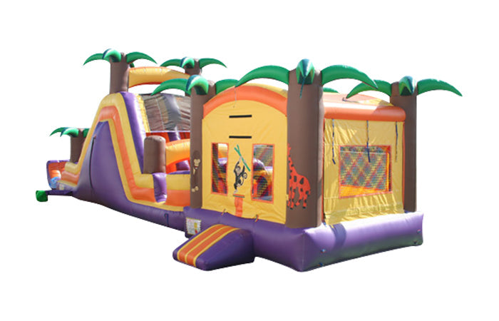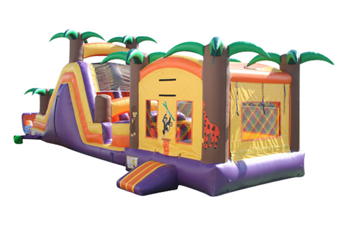 This Tropical backload combo unit can be used in various different ways. This unit can be a large combo unit. This can be attached to a jumper which kids can crawl through a hole and go to the slide side. This unit can also be used as a jumper by itself. This unit can also be detached from the jumper and the backload slide to be used by itself, as well as the jumper being able to be used by itself.