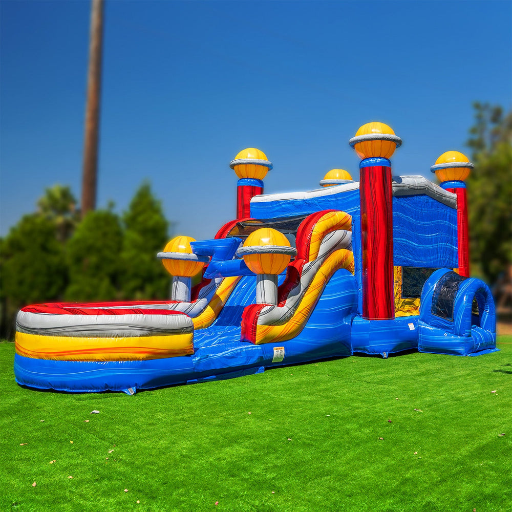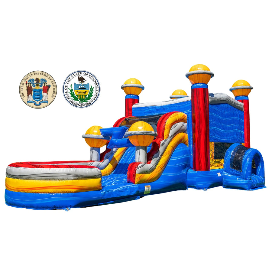 This unit is part of the XL Series from JumpOrange - the next level in inflatables. XL Series combos feature premium 15 oz PVC Vinyl, non-slippery stairs, heat-sealed seams, extra vinyl at stress points, multiple deflation zippers and drains, and attached pools. This makes them great year-round units with an excellent return on investment. With proven quality and exotic new themes available, these inflatables build on previous models while also creating new possibilities!