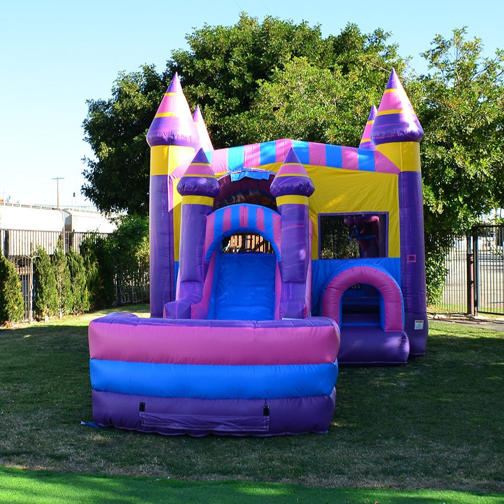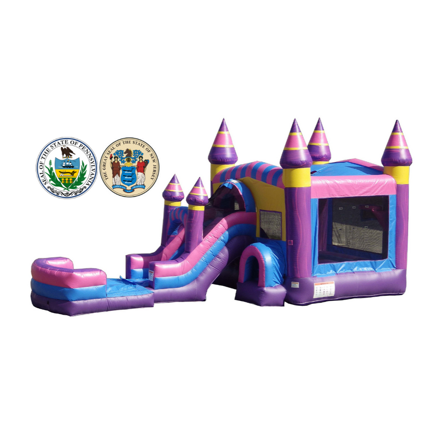The Cotton Candy (5 In 1) Mega Front Loader Combo is one sweet inflatable! It features a 6-foot single-lane slide along with an inflated landing zone for dry use. Its fully enclosed entrance helps keep small children from falling off from the side of the ramp, while a tunnel under the slide can turn the unused corner of the combo into a secret hideout. Its variety of features makes this unit a great addition to any party!