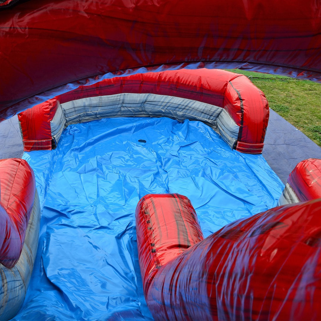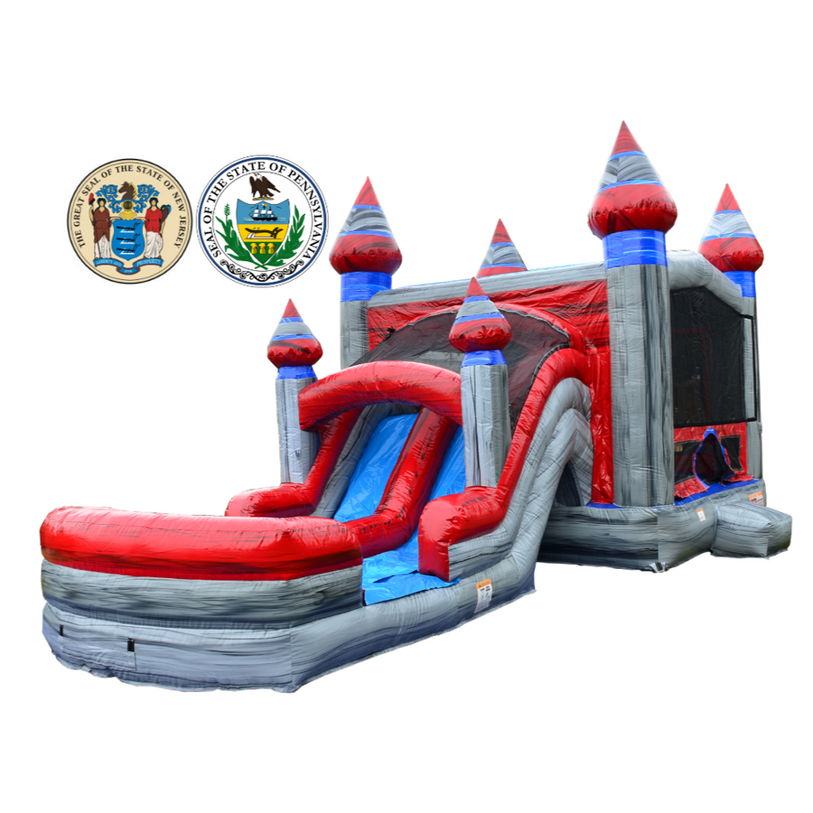 - FEATURES: Dual Lane Slide, Bounce House, Non-Slippery Climb Wall, Basketball Hoop, Emergency Exit, Waterproof Business Pocket, Business Banner, and Attached Inflated Splash Pool