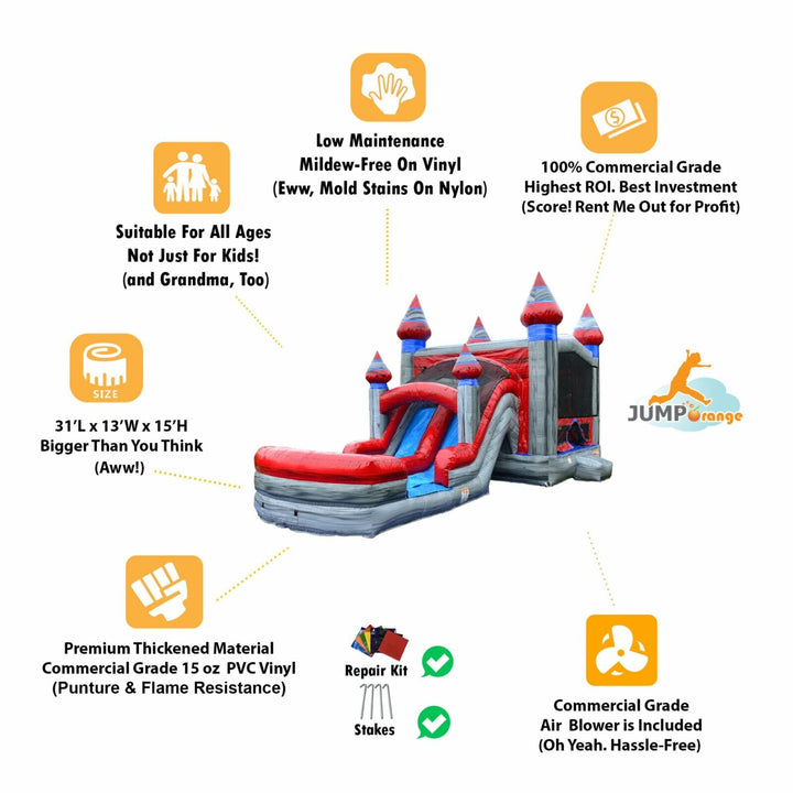 This unit is part of the X Series from JumpOrange, which features premium 15 oz PVC Vinyl, non-slippery stairs, extra vinyl at stress points, multiple deflation zippers and drains, and heat-sealed slide seams. This bounce house with slide comes with an attached inflated splashing pool.