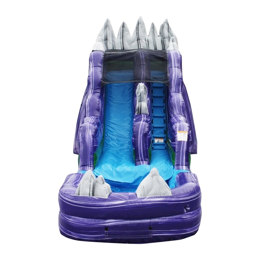 The all-new wet and dry slide with blower and accessories is just what you need. These mega waterparks are made of 100% industrial grade PVC 15 oz Vinyl for heavy usage through many jumping, bouncing, slipping, and sliding sessions. These slides equip with non-slippery climbing material and a handle on the ladder that prevents kids from falling and standing while climbing up. Child safe netting prevents kids from standing up at the platform top; fully covered shade netting ensures that kids can slide down securely. The seams are heat-sealed throughout the slide and pool areas to minimize water leaking. Hassle-free packaging is delivered and unloaded to your home through a freight company.