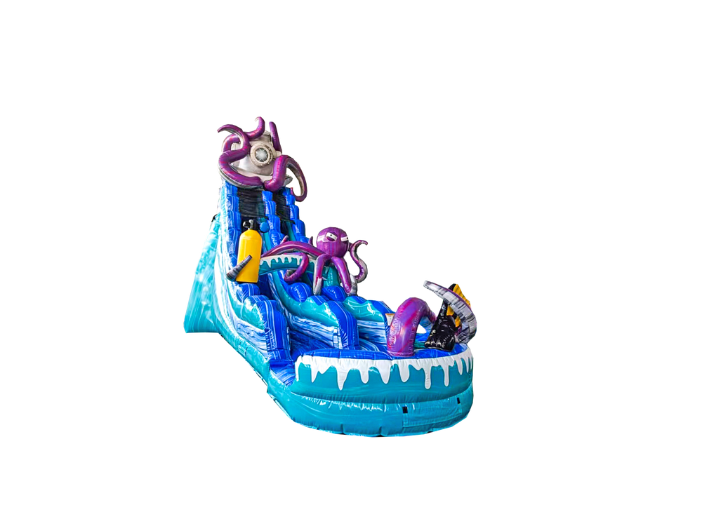 Dive in with the Deep Sea 25 Ft Slide is the perfect summer slide! Riders must navigate through a tangle of tentacles to make it to the top. Bring this slide along for your next aquatic-themed party or event!