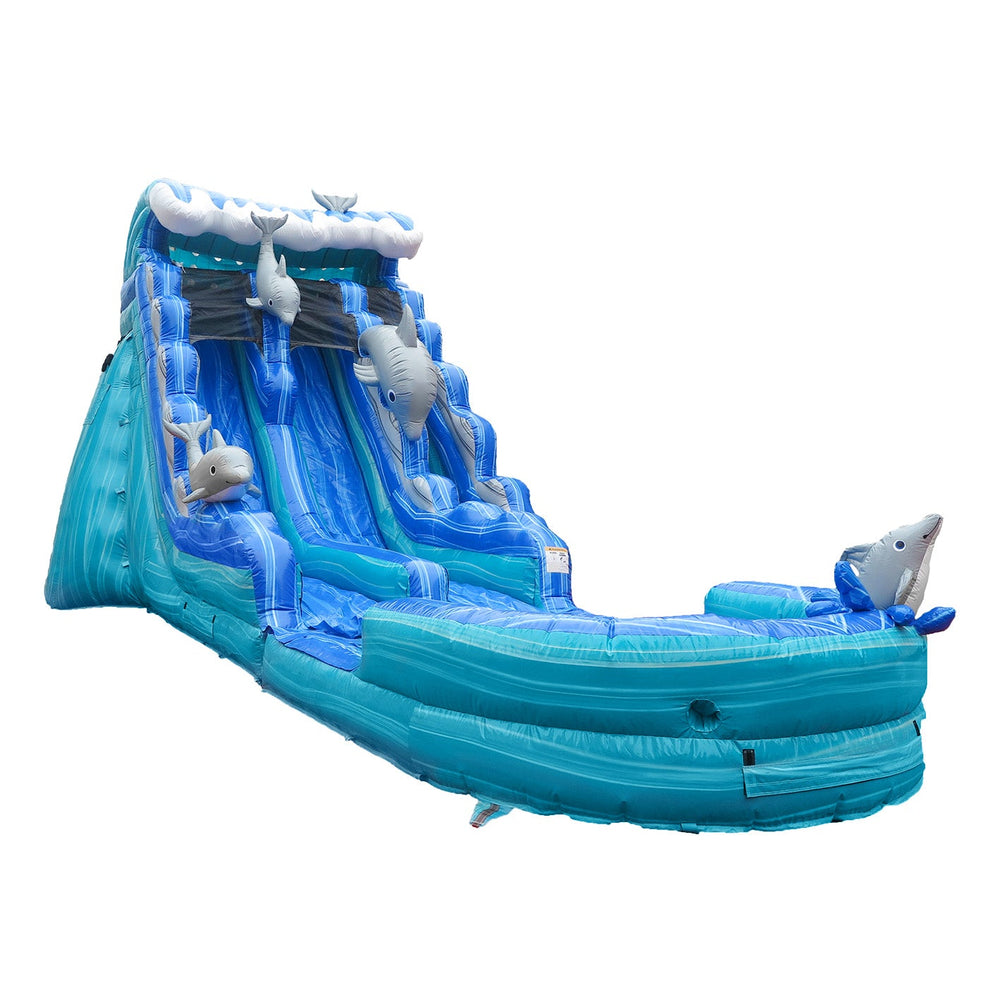 The Dolphin 20 ft dual lane slide is ready for another player! This inflatable offers a two-player gaming experience thanks to its dual lane design! This inflatable is the perfect choice for video game-themed parties!