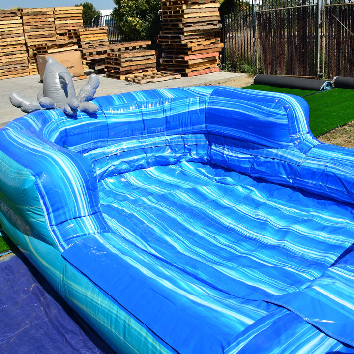 The all-new wet and dry slide with blower and accessories is just what you need. These mega waterparks are made of 100% industrial grade PVC 15 oz Vinyl for heavy usage through many jumping, bouncing, slipping, and sliding sessions. These slides equip with non-slippery climbing material and a handle on the ladder that prevents kids from falling and standing while climbing up. Child safe netting prevents kids from standing up at the platform top; fully covered shade netting ensures that kids can slide down securely. The seams are heat-sealed throughout the slide and pool areas to minimize water leaking. Hassle-free packaging is delivered and unloaded to your home through a freight company.