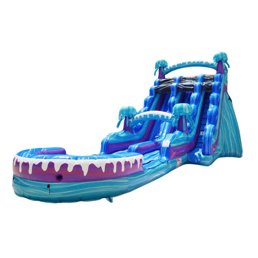 The all-new wet and dry slide with blower and accessories is just what you need. These mega waterparks are made of 100% industrial grade PVC 15 oz Vinyl for heavy usage through many jumping, bouncing, slipping, and sliding sessions. These slides equip with non-slippery climbing material and a handle on the ladder that prevents kids from falling and standing while climbing up. Child safe netting prevents kids from standing up at the platform top; fully covered shade netting ensures that kids can slide down securely. The seams are heat-sealed throughout the slide and pool areas to minimize water leaking. Hassle-free packaging is delivered and unloaded to your home through a freight company.