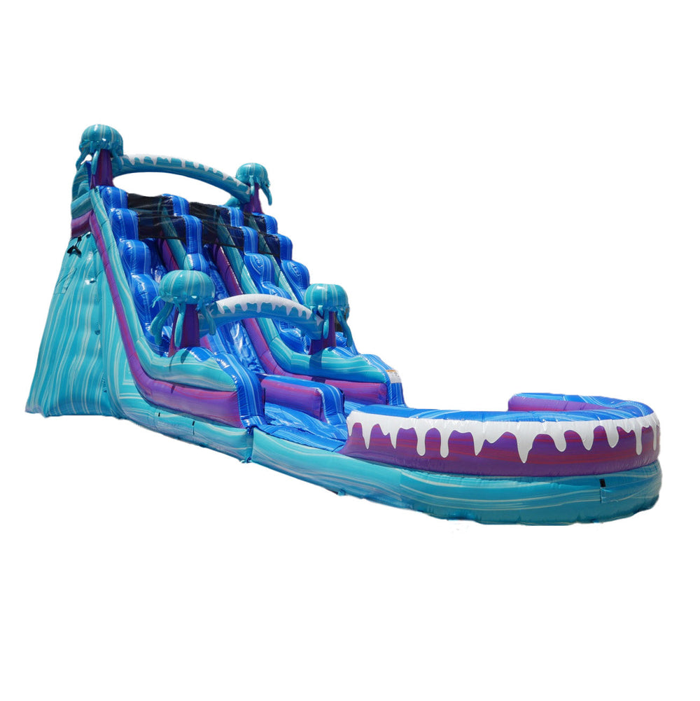 JumpOrange Electric 20 ft dual lane slide with a detachable pool is a first choice for children and adults to have a splash fun party on sunny days. This water slide sits 12 feet tall and 36 feet long; this waterslide ensures a wow factor for big kids! These moonwalks come with shade to keep direct sun off kiddos.