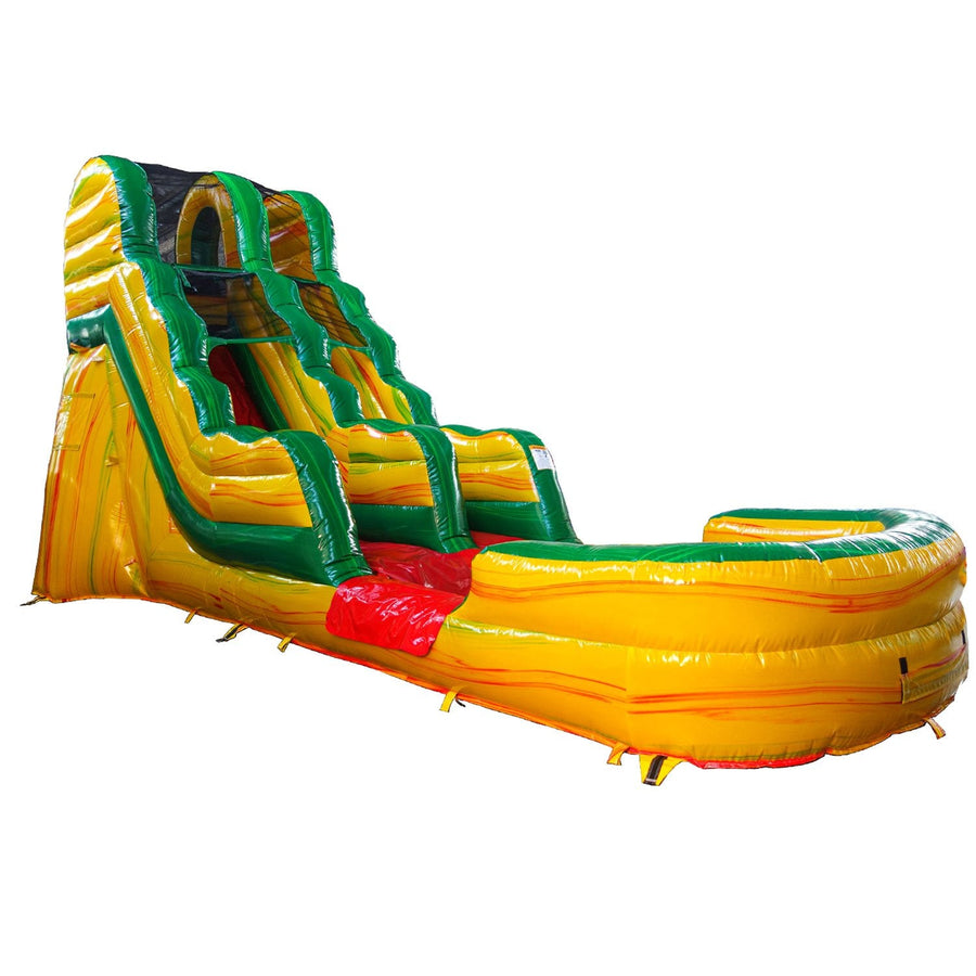 The all-new wet and dry slide with blower and accessories is just what you need. These mega waterparks are made of 100% industrial grade PVC 15 oz Vinyl for heavy usage through many jumping, bouncing, slipping, and sliding sessions. These slides equip with non-slippery climbing material and a handle on the ladder that prevents kids from falling and standing while climbing up. Child safe netting prevents kids from standing up at the platform top; fully covered shade netting ensures that kids can slide down securely. The seams are heat-sealed throughout the slide and pool areas to minimize water leaking. Hassle-free packaging is delivered and unloaded to your home through a freight company.
