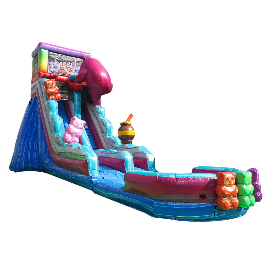JumpOrange Gummy bears 19 ft slide with a detachable pool is a first choice for children and adults to have a splash fun party on sunny days. This water slide sits 12 feet tall and 36 feet long; this waterslide ensures a wow factor for big kids! These moonwalks come with shade to keep direct sun off kiddos.