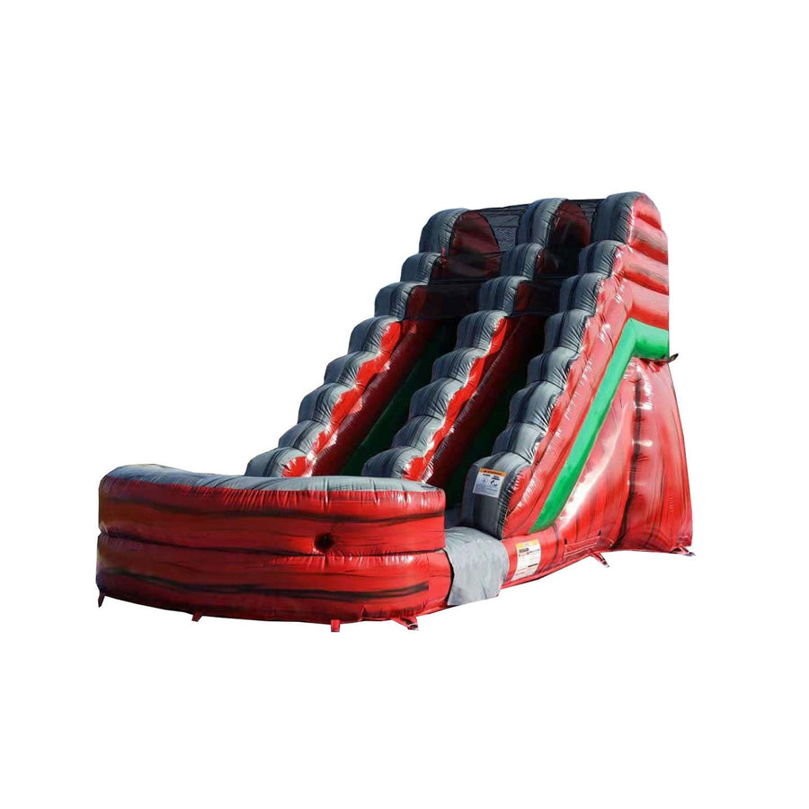 The all-new wet and dry slide with blower and accessories is just what you need. These mega waterparks are made of 100% industrial grade PVC 15 oz Vinyl for heavy usage through many jumping, bouncing, slipping, and sliding sessions. These slides equip with non-slippery climbing material and a handle on the ladder that prevents kids from falling and standing while climbing up. Child safe netting prevents kids from standing up at the platform top; fully covered shade netting ensures that kids can slide down securely. The seams are heat-sealed throughout the slide and pool areas to minimize water leaking. Hassle-free packaging is delivered and unloaded to your home through a freight company.