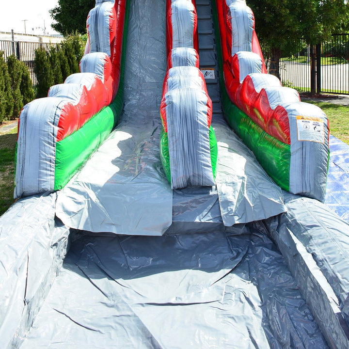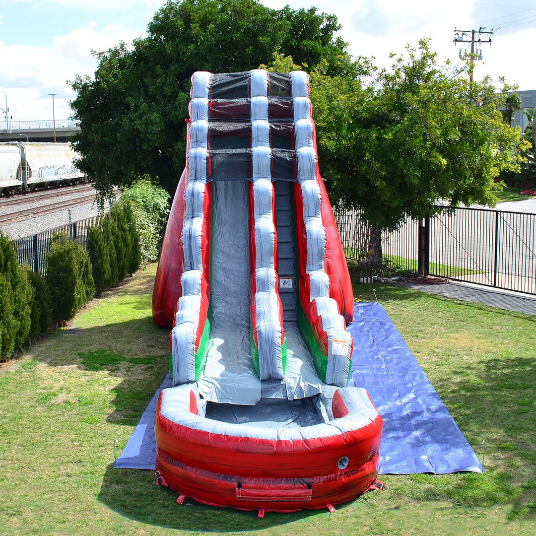 This all-new wet and dry slide with blower and accessories is just what you need. These mega waterparks are made of 100% industrial grade PVC 15 oz Vinyl for heavy usage through many jumping, bouncing, slipping, and sliding sessions. These slides are equipped with non-slippery climbing material and a handle on the ladder that prevents kids from falling and standing while climbing up. Child safe netting prevents kids from standing up at the platform top; fully covered shade netting ensures that kids can slide down securely. The seams are heat-sealed throughout the slide and pool areas to minimize water leaking. Hassle-free packaging is delivered and unloaded to your home through a freight company.