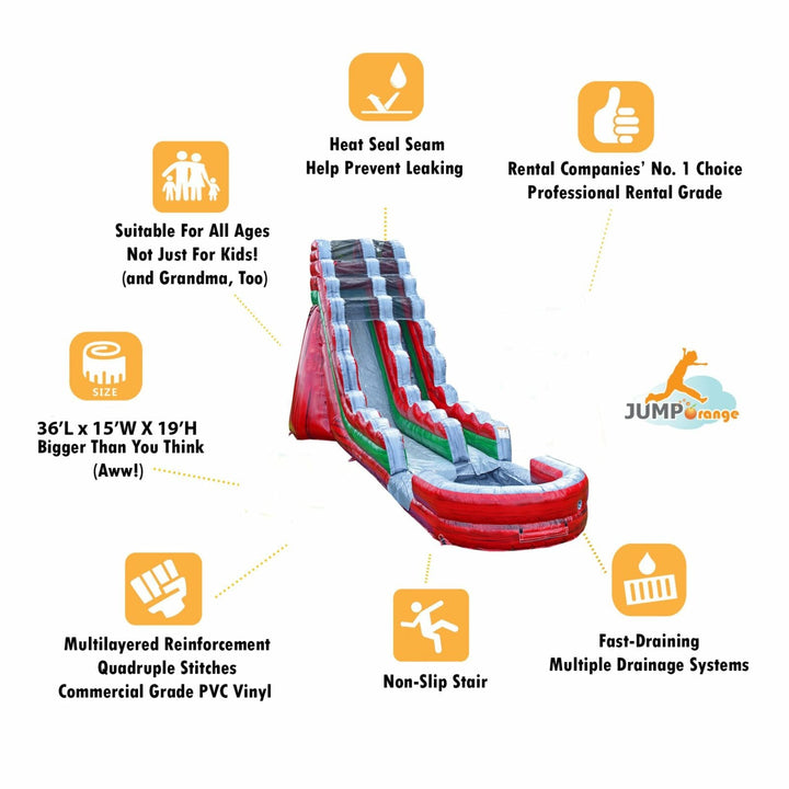 JumpOrange 19 ft giant climber slide is a first choice for children and adults to have a fun splash party on sunny days. This water slide sits 12 feet tall and 36 feet long; this waterslide ensures a wow factor for big kids! These moonwalks come with shade to keep direct sun off kiddos.