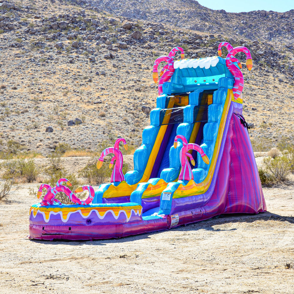 The all-new wet and dry slide with blower and accessories is just what you need. These mega waterparks are made of 100% industrial grade PVC 15 oz Vinyl for heavy usage through many jumping, bouncing, slipping, and sliding sessions. These slides equip with non-slippery climbing material and a handle on the ladder that prevents kids from falling and standing while climbing up. Child safe netting prevents kids from standing up at the platform top; fully covered shade netting ensures that kids can slide down securely. The seams are heat-sealed throughout the slide and pool areas to minimize water leaking. Hassle-free packaging is delivered and unloaded to your home through a freight company.