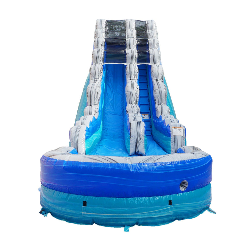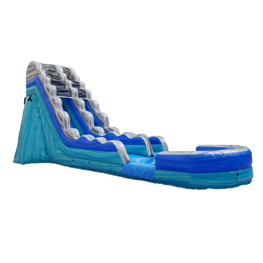 JumpOrange 19 ft Ocean blue 19 ft slide is a first choice for children and adults to have a fun splash party on sunny days. This water slide sits 12 feet tall and 36 feet long; this waterslide ensures a wow factor for big kids! These moonwalks come with shade to keep direct sun off kiddos.