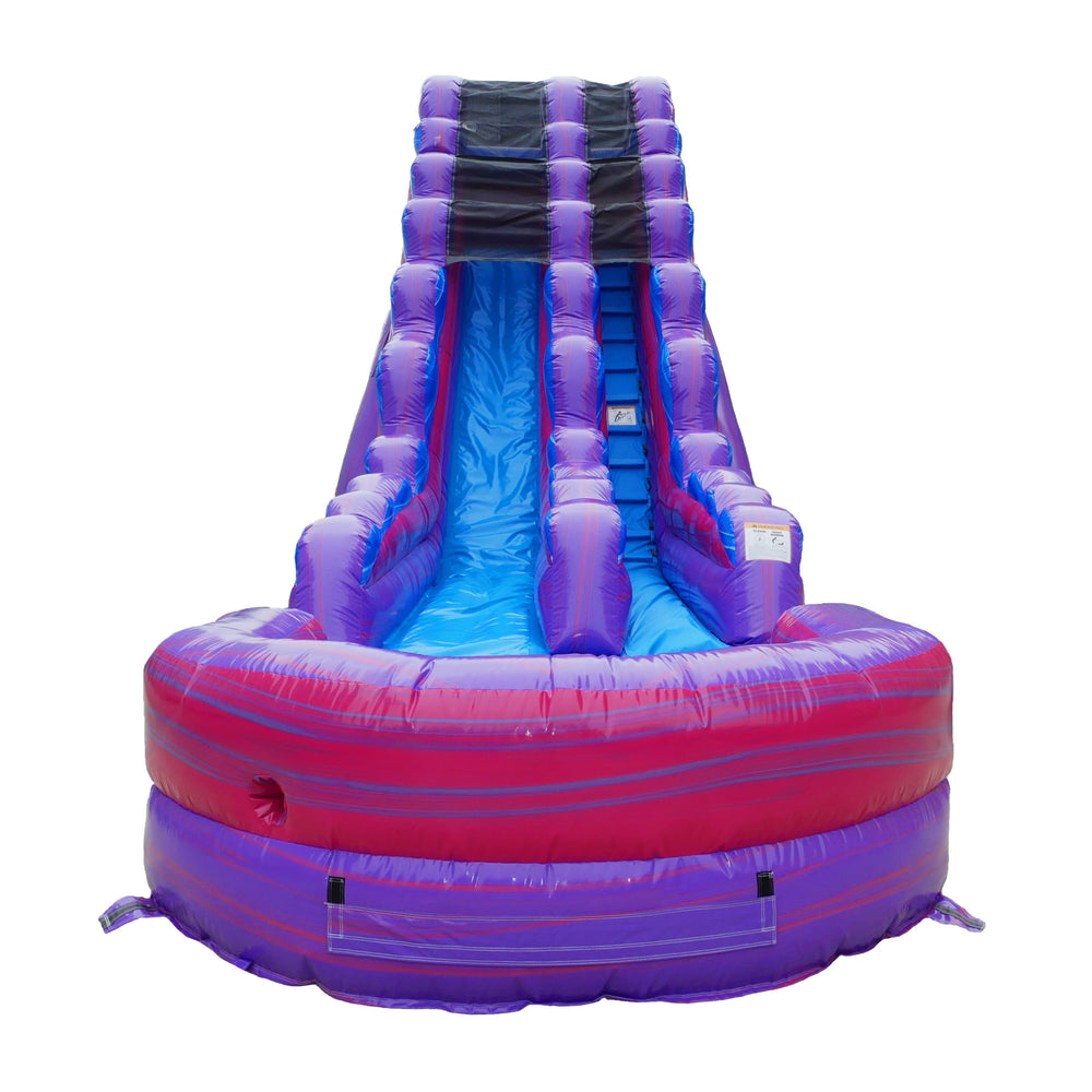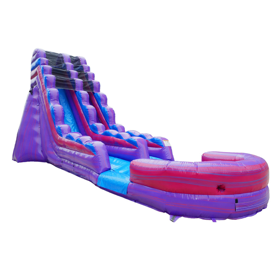 JumpOrange Purplish 19 ft slide is a first choice for children and adults to have a fun splash party on sunny days. This water slide sits 12 feet tall and 36 feet long; this waterslide ensures a wow factor for big kids! These moonwalks come with shade to keep direct sun off kiddos.