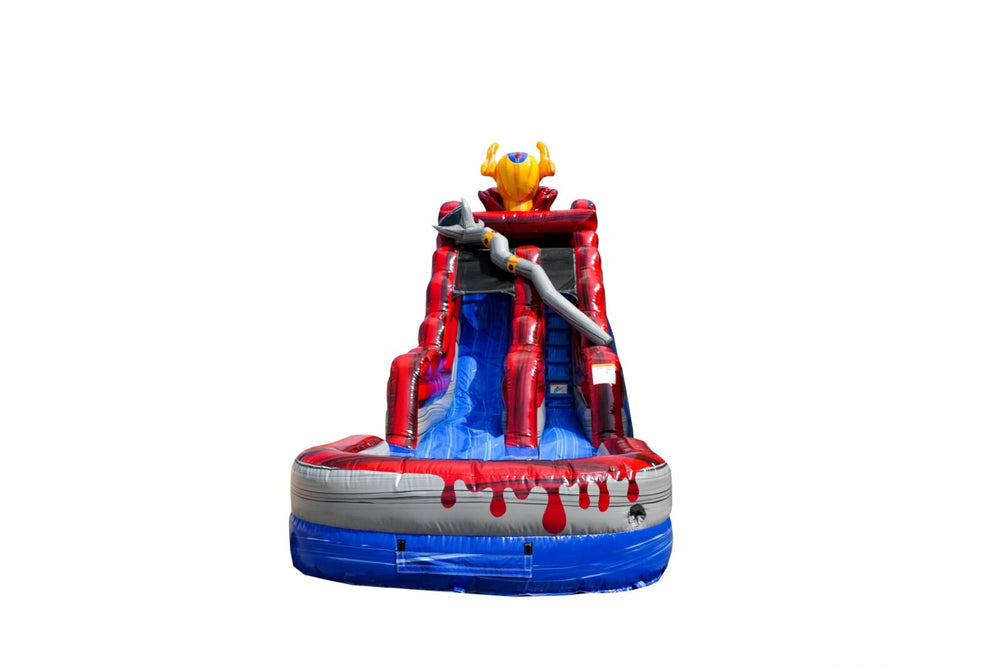 The all-new wet and dry slide with blower and accessories is just what you need. These mega waterparks are made of 100% industrial grade PVC 15 oz Vinyl for heavy usage through many jumping, bouncing, slipping, and sliding sessions. These slides equip with non-slippery climbing material and a handle on the ladder that prevents kids from falling and standing while climbing up. Child safe netting prevents kids from standing up at the platform top; fully covered shade netting ensures that kids can slide down securely. The seams are heat-sealed throughout the slide and pool areas to minimize water leaking. Hassle-free packaging is delivered and unloaded to your home through a freight company.