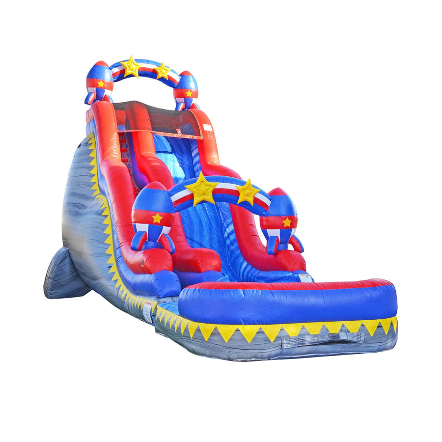 The Rocket Double Drop Wave 24 Ft Slide adds a fun twist to your average inflatable slide! By altering the slide's slope, riders can experience going down twice in one trip! Overhead netting prevents jumping from the top and protects kids on the way down securely. Bring this slide for bigger events such as corporate parties and family reunions!