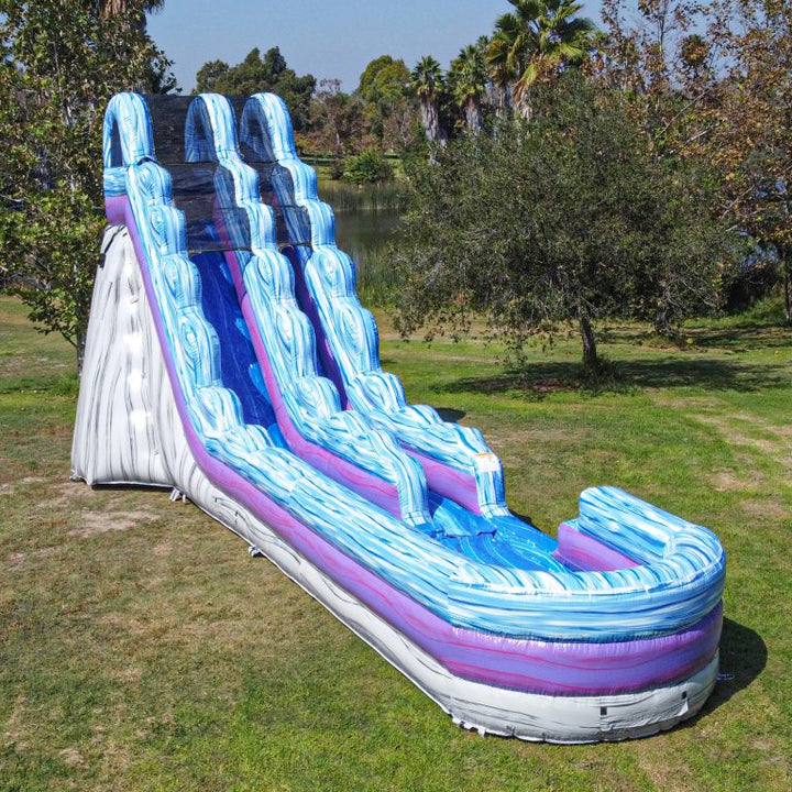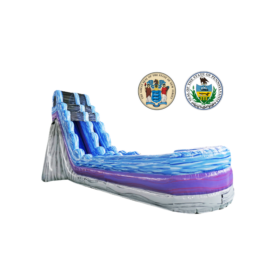 This all-new wet and dry slide with blower and accessories is just what you need. These mega waterparks are made of 100% industrial grade PVC 15 oz Vinyl for heavy usage through many jumping, bouncing, slipping, and sliding sessions. These slides are equipped with non-slippery climbing material and a handle on the ladder that prevents kids from falling and standing while climbing up. Child safe netting prevents kids from standing up at the platform top; fully covered shade netting ensures that kids can slide down securely. The seams are heat-sealed throughout the slide and pool areas to minimize water leaking. Hassle-free packaging is delivered and unloaded to your home through a freight company.