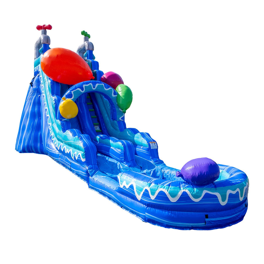 JumpOrange Water Balloons 19 ft slide with a detachable pool is a first choice for children and adults to have a splash fun party on sunny days. This water slide sits 12 feet tall and 36 feet long; this waterslide ensures a wow factor for big kids! These moonwalks come with shade to keep direct sun off kiddos.