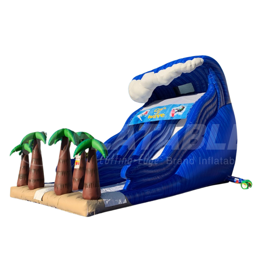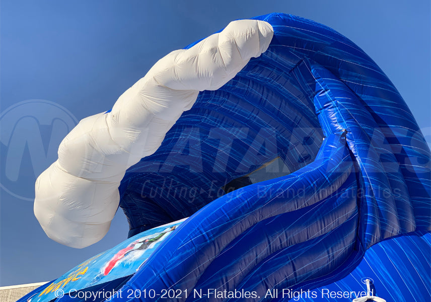 This unit has 2 slide lanes with waving surfaces as well as a climbing lane. It features eye-catching water colored vinyl and a digitally printed sun shade. The front entrance and exit makes supervision easy for any trained operator. This unit is also available in a larger 27' version.