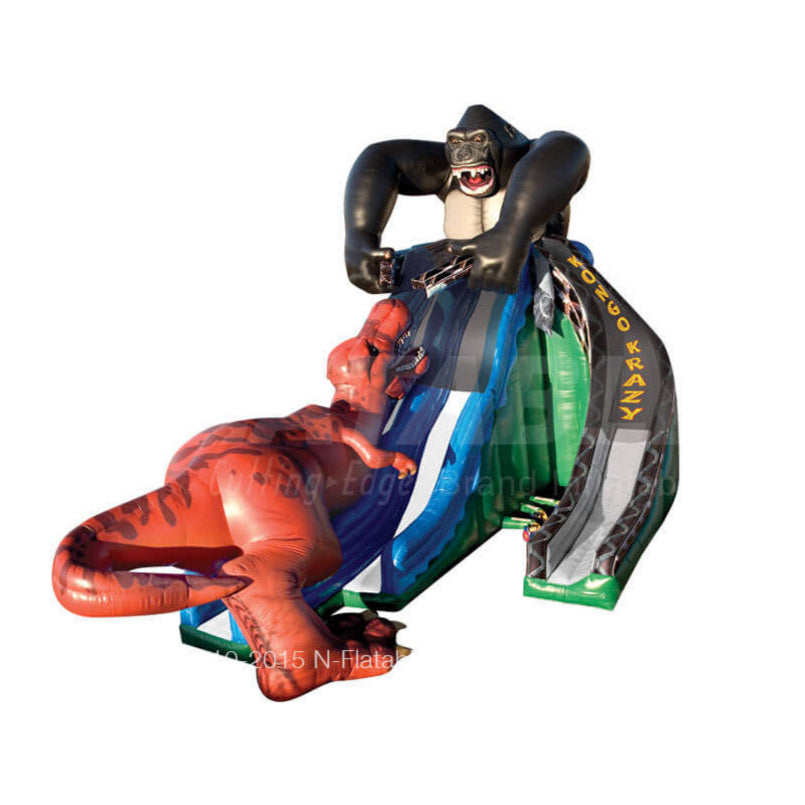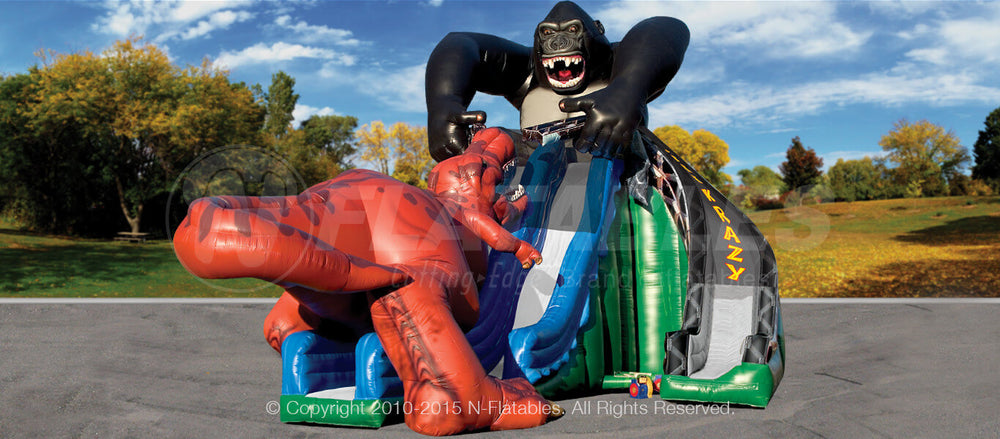 This thrilling inflatable feautures stunning digitally printed artwork and has 1 straight slide lane, 1 waving slide lane, and a climbing lane. It is also available in 20' single lane, 28' single lane, and 28' triple lane versions.