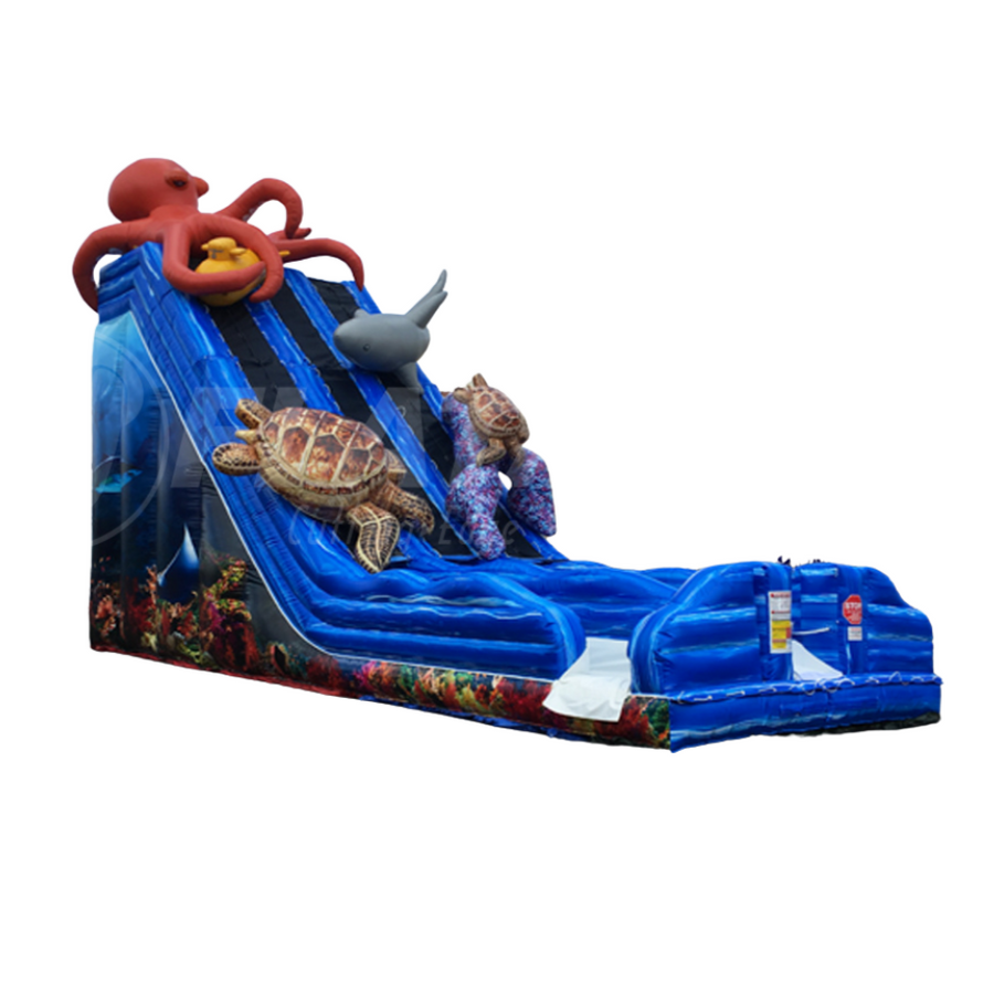 It's an underwater voyage of unparalleled proportions with a 2-lane slide that your patrons are sure to love! This unit features stunning attention to detail, realistic digital art and colorful ocean characters. This slide is also available in a 29' dry slide and a 29' water slide.