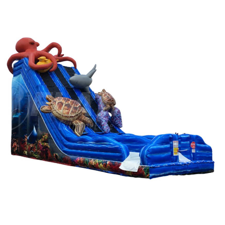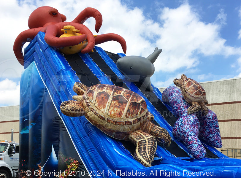 It's an underwater voyage of unparalleled proportions with a 2-lane slide that your patrons are sure to love! This unit features stunning attention to detail, realistic digital art and colorful ocean characters. This slide is also available in a 20' dry slide and a 29' water slide.