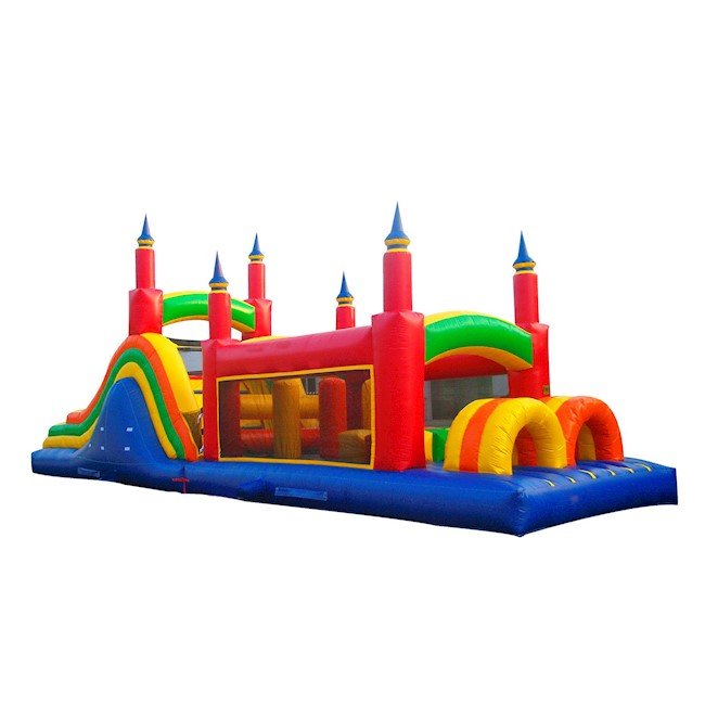The 40 ft Rainbow Mega Obstacle Course is an eye-catching unit with a physical challenge! The two-piece open-air design structure enables an easy setup. Rainbow archways welcome riders to the obstacle course's starting line, where they must maneuver around a variety of pop-up obstacles.