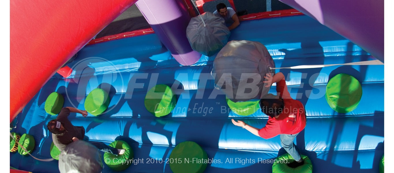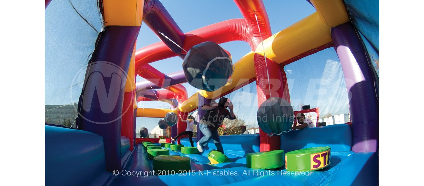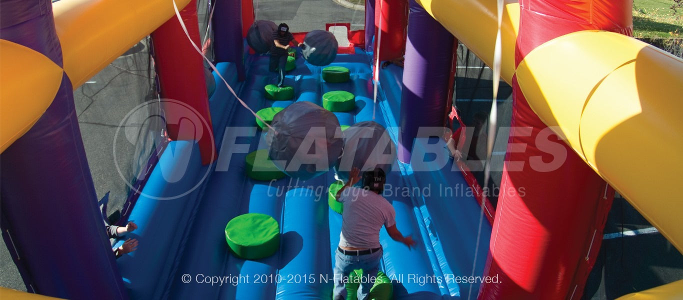 BoulderDash Jr. is the perfect interactive challenge! Two opponents face off head-to-head, zig-zagging across the raised foam platforms while they dodge 4 swinging foam boulders being hurled at them. The first person to make it to the other side without falling wins. It's a dash to the finish in this game that combines both speed and strategy. Less active participants can also enjoy being a "boulder-thrower" while more active participants attempt to complete the challenge. This unit is also available in a medieval-theme.
