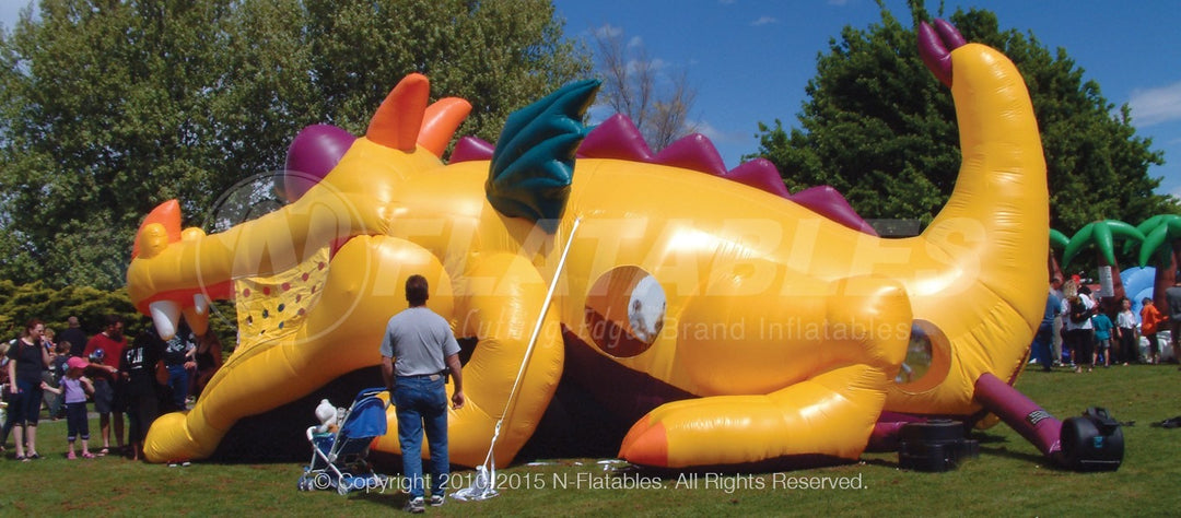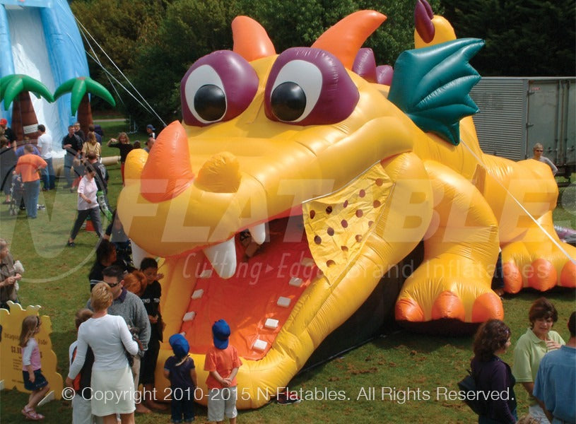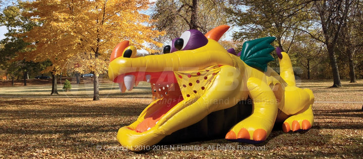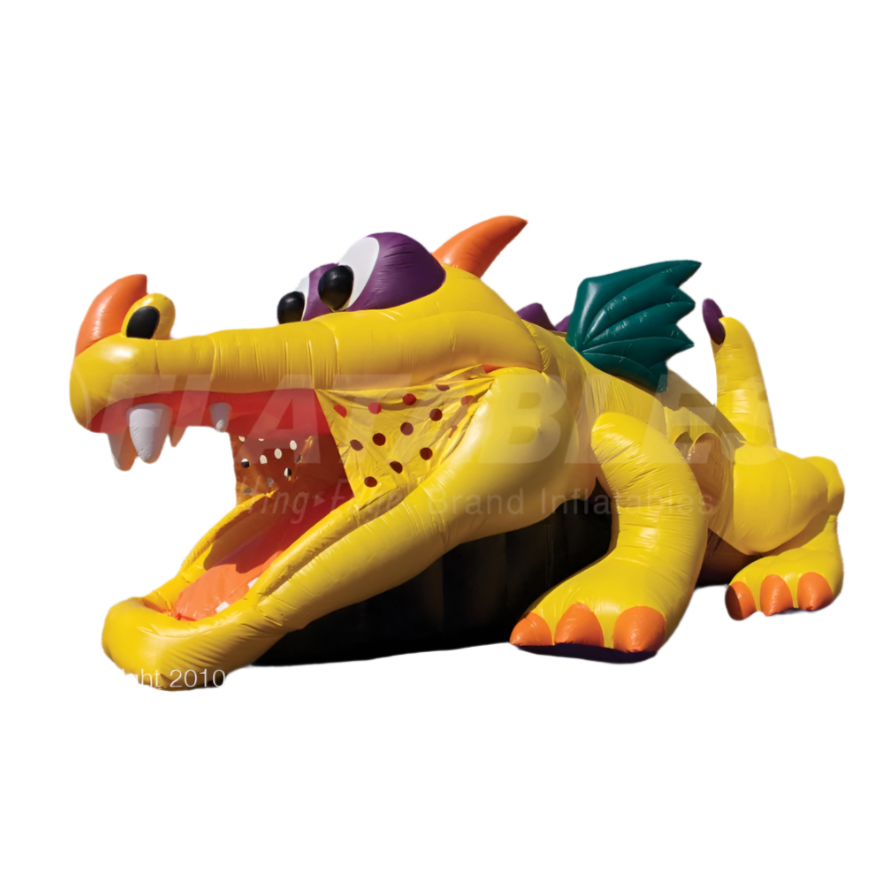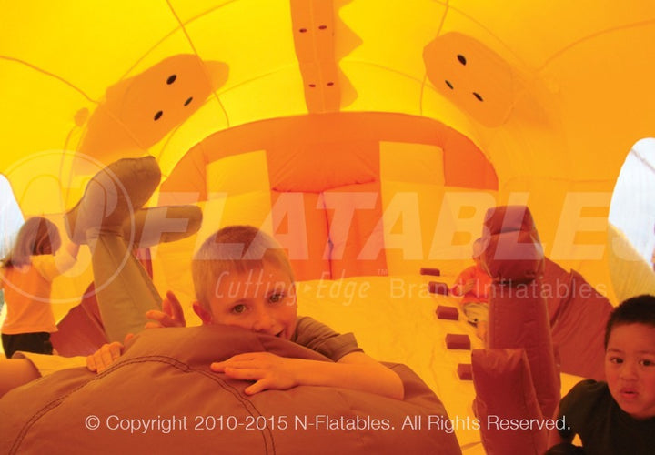 This popular unit is a sure crowd-pleaser. Children climb up the mouth of the dragon, push through the inflated doors and slide down into the belly where they can bounce around themed pop-ups. When done, they slide out the opening near the tail. There are clear viewing windows on either sides so that parents and operators can watch the kids.