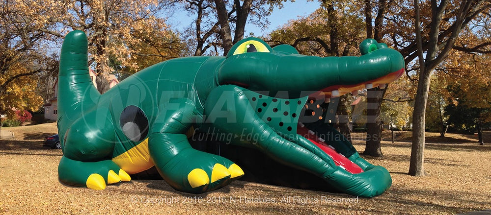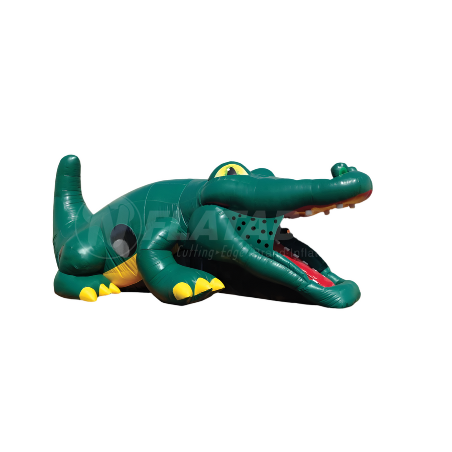 Children climb up the mouth of the gator, push through the inflated doors and slide down into the belly where they can bounce around themed pop-ups. When done, they slide out the opening near the tail. There are clear viewing windows on either sides so that parents and operators can watch the kids.